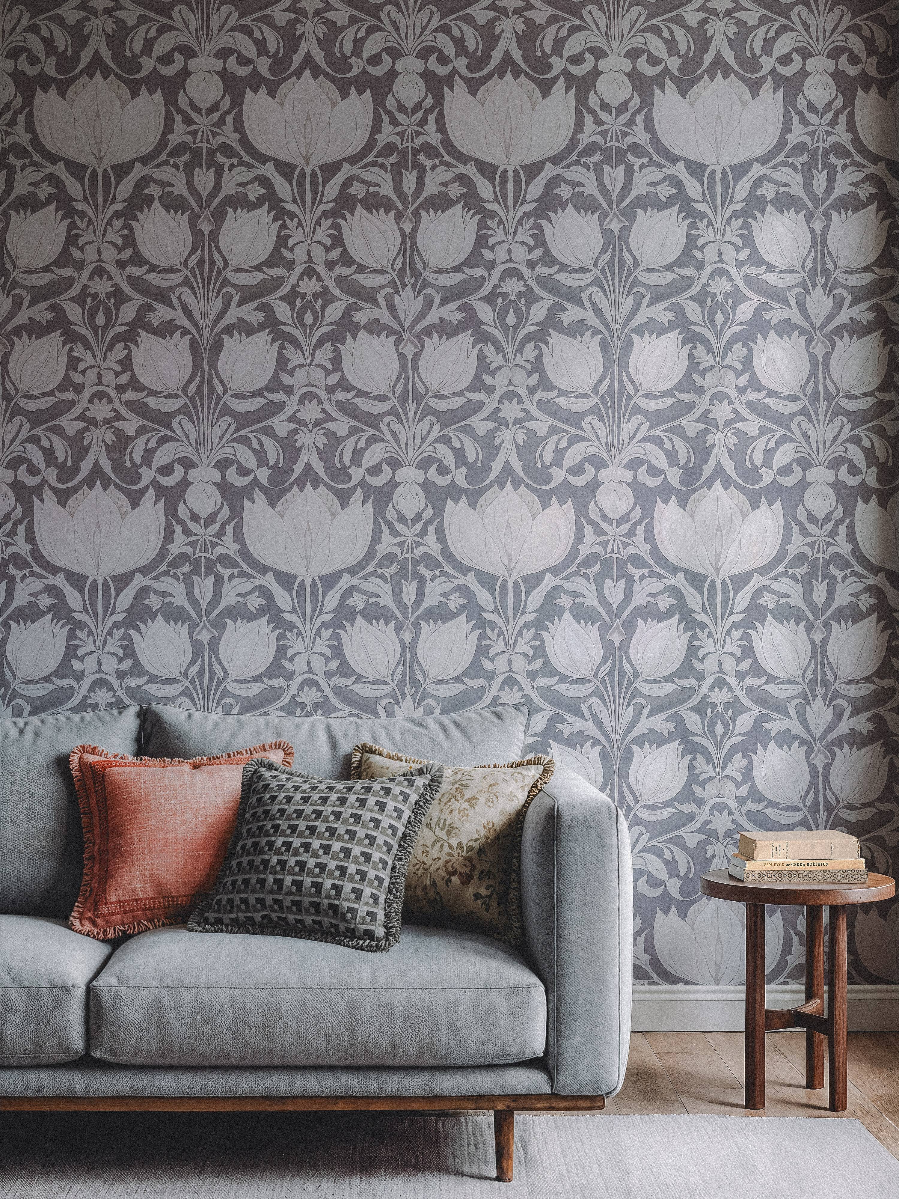 In Quarry Grey, Bergslagen’s stylised tulips rest upon a greyed stone ground — architectural yet soft. The pronounced linen grain frames the palette; petals traced in gentle pewter-greige and flint-ash are lifted by parchment mist and a clear linen white. Subtly dramatic, tactile, and serenely composed.