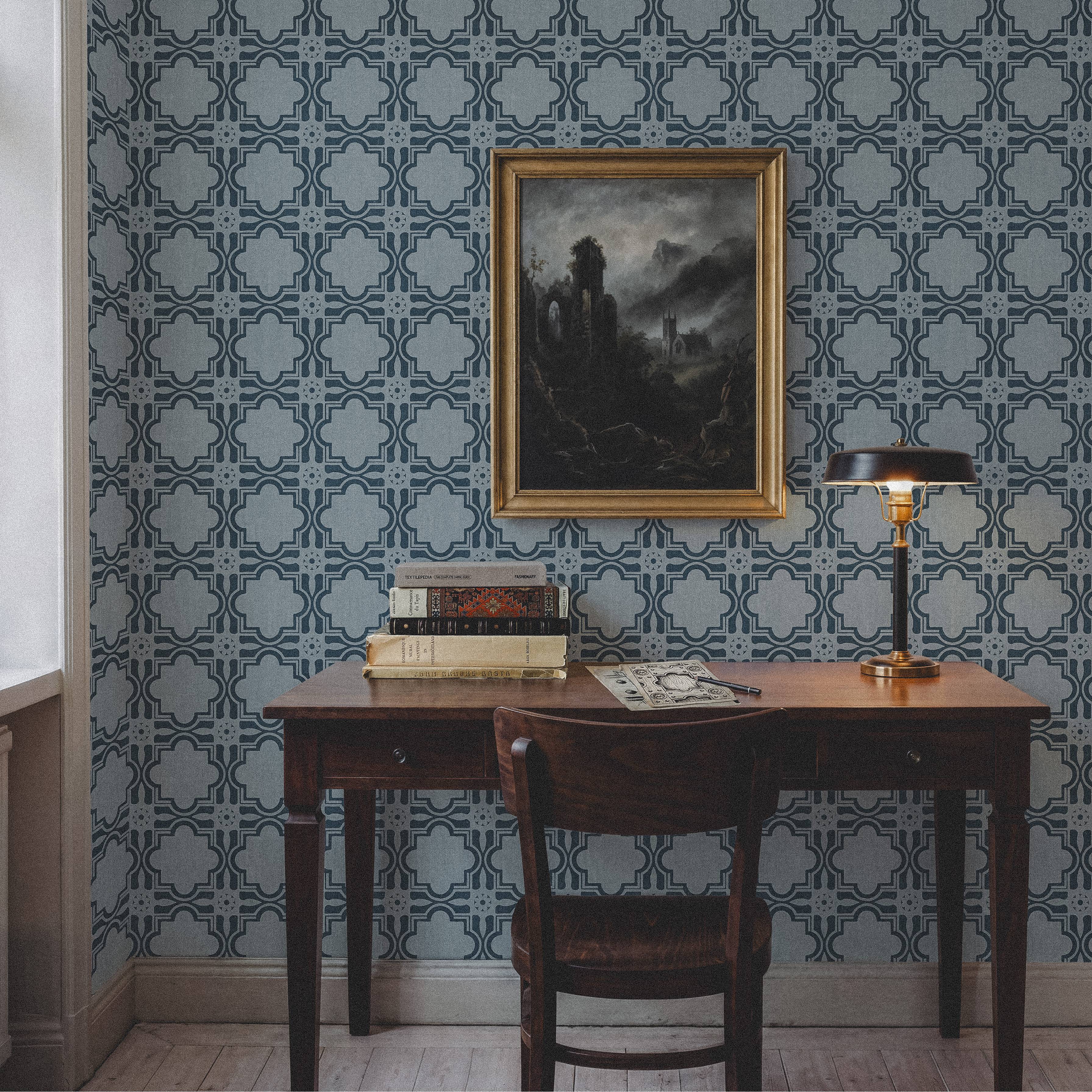 A sophisticated Neo-Gothic pattern rendered in a deep, atmospheric palette of Indigo and Slate Blue. Inspired by the meticulous 19th-century restoration of Linköping Cathedral by Helgo Zettervall, this design abstracts the iron-studded joinery of the cathedral's West and South portals. The textured surface simulates the weave of heavy antique linen. A medium-scale pattern that brings a calm, architectural gravity to studies, libraries, and hallways.