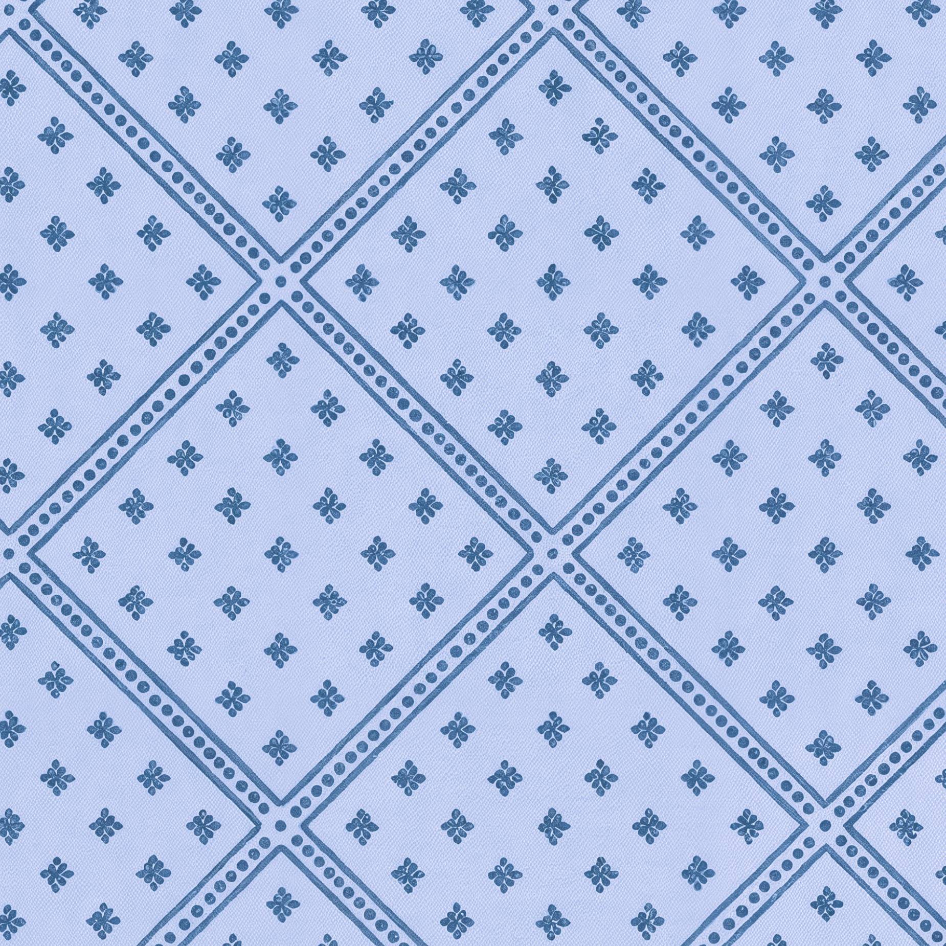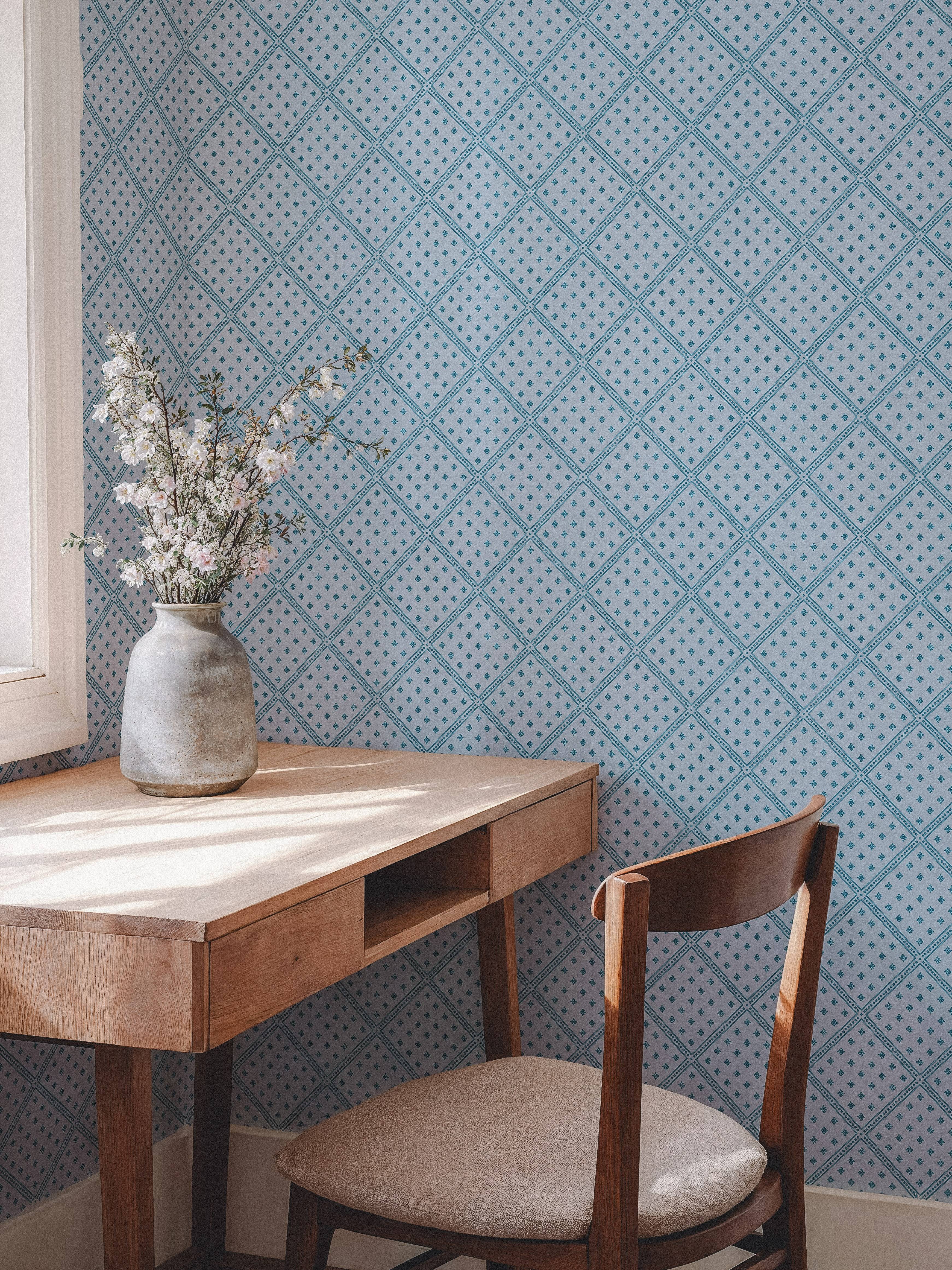 With a cool palette of fjord blues, this wallpaper arranges delicate clover rosettes within a diamond lattice. The surface simulates canvas linen with a screen printed finish, echoing Nordic folk stencilling. The repeat is a small-scale grid that reads crisp and calm.