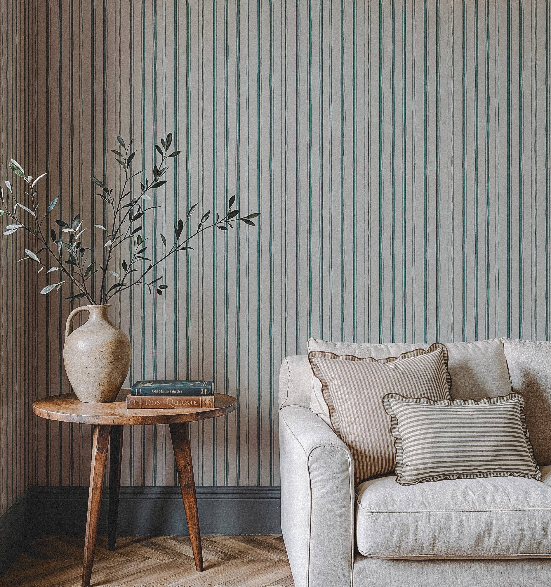 With its soft olive green and sand-colored lines, this wallpaper captures both the subtlety of color and the depth of texture. The woven appearance lends a sense of handmade elegance and natural beauty.