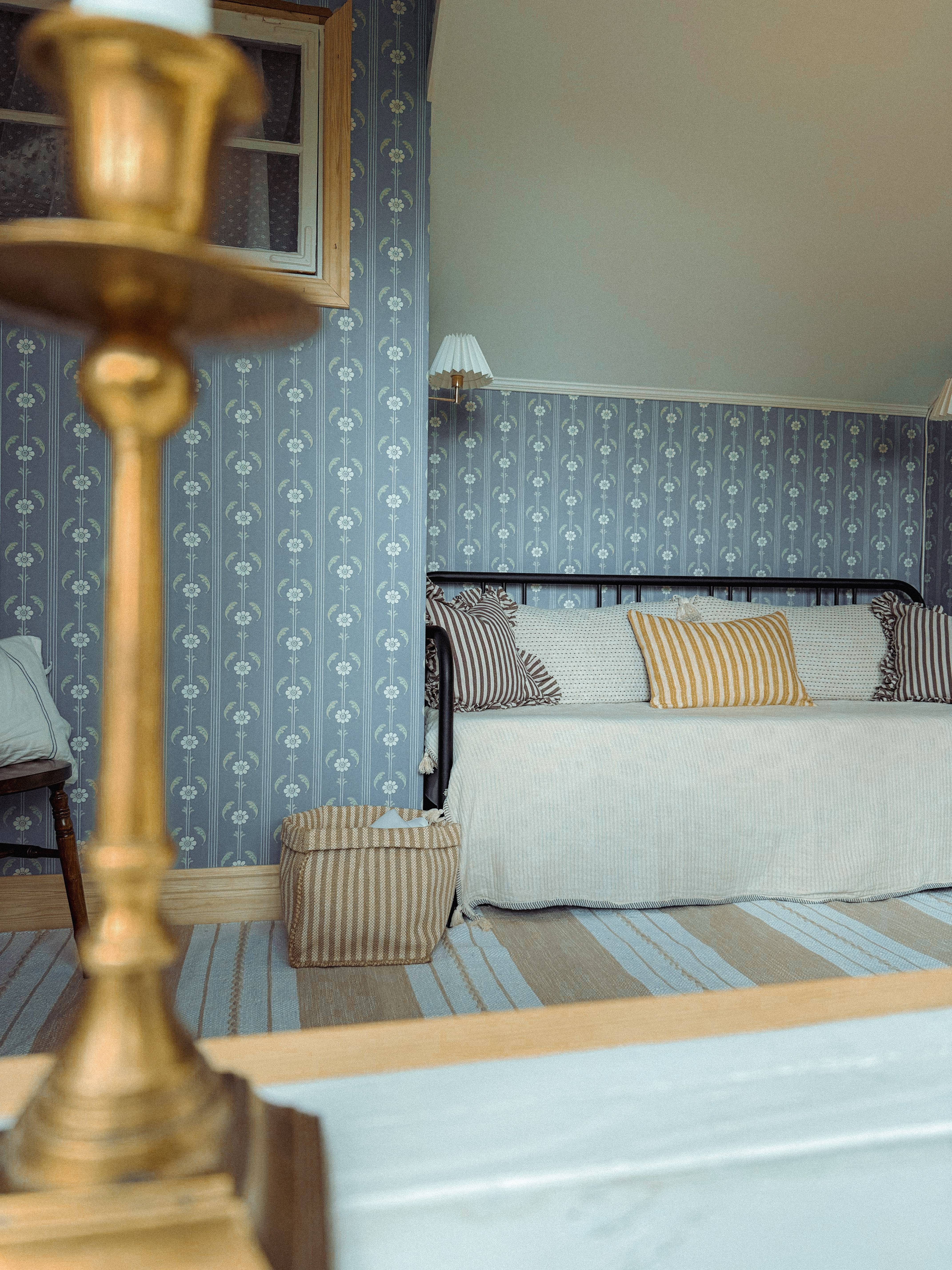 We take our starting point in gustaviansk simplicity—the restrained Swedish neoclassicism of the late 18th century—but allow it to dissolve gently into folk memory. Think Madicken’s bedroom wallpaper, or something glimpsed in a hallway in Bullerbyn. Each pattern carries traces of nobility—and of how that nobility was interpreted by the common hand.