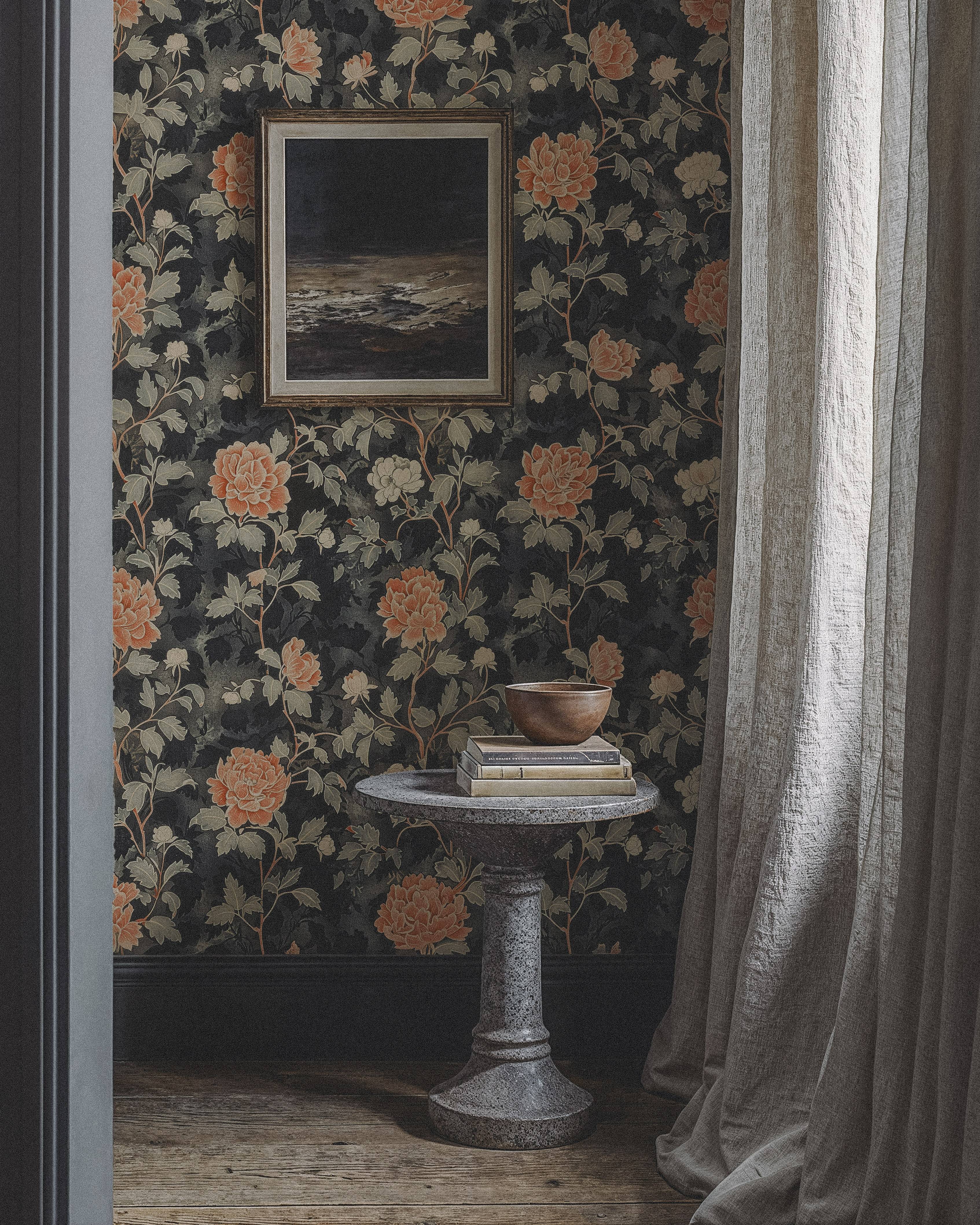 Peony Shadows blends late Arts and Crafts influences with traditional Japanese form and a textile-driven understanding of rhythm and tone. The surface evokes the appearance of hand block printing over a velvet-like ground where a deep black-olive tone anchors the coral blooms and sage-grey foliage. Medium scale motifs with soft tonal transitions create a calm yet atmospheric presence.